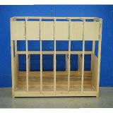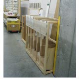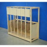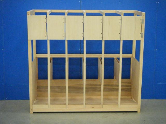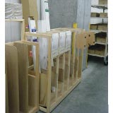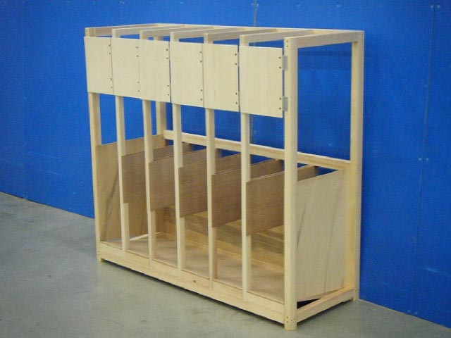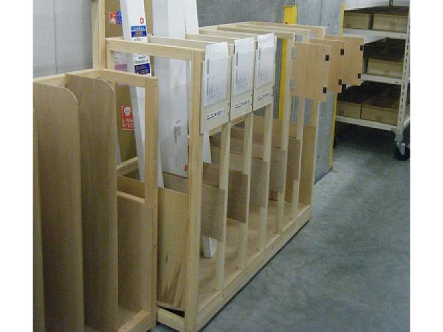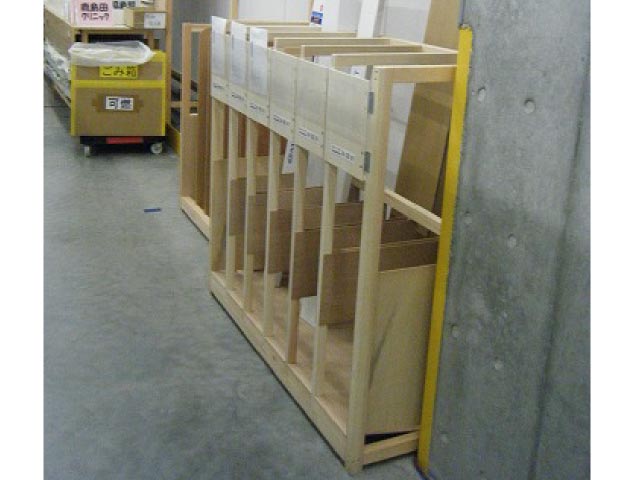 細長いケースに入った商品を格納するために製作した収納ラックです。できるだけスペースを取らず、かつ収納、取り出しが簡単にできるものを目指しています。現場においては、通常の商品棚と並んでも邪魔にならないよう、奥行きも調節しています。